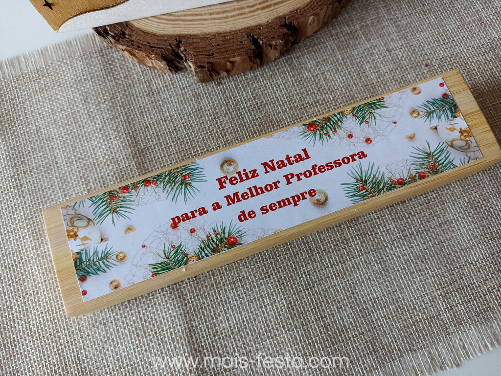 Caneta branca com acabamentos metalizados, gravada com o nome da professora/professor ou educadora, com caixinha com rótulo com mensagem personalizada.